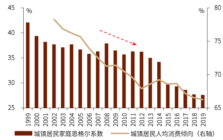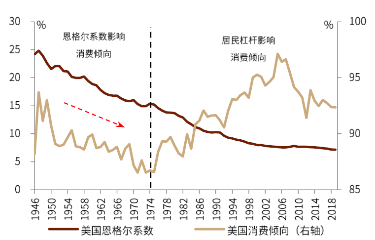 注:1970年代后,美国恩格尔系数降至较低水平,对居民消费倾向影响趋弱,而居民杠杆(贷款消费)逐渐成为影响居民消费倾向的重要变量,一度推升消费倾向超过95%。