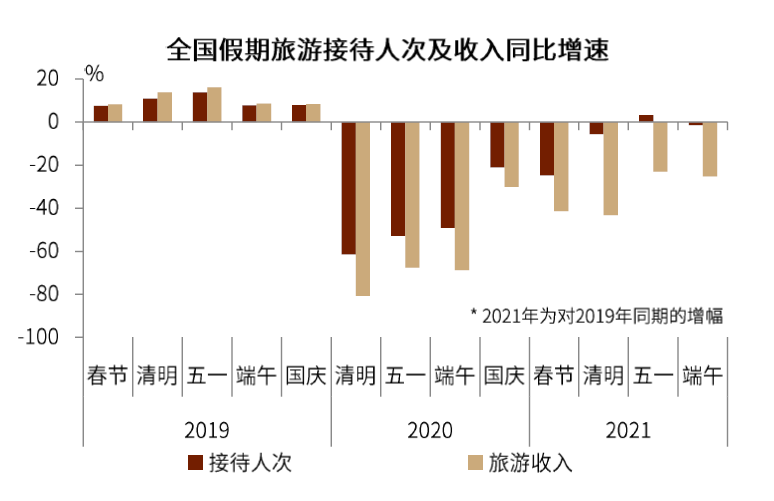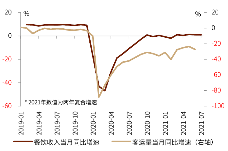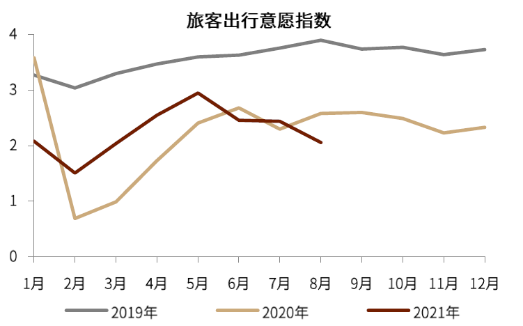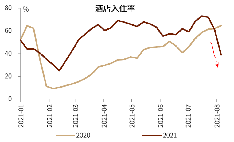 但疫情的压制可能长期存在,对未来消费改善形成制约。7月以来国内疫情反弹,德尔塔毒株使得本轮疫情扩散广、传播快,防控难度加大,我国各地加强交通管制、社交管控等疫情防控举措。局部地区的疫情反弹,通常会对当地消费形成明显压制,比如2020年7-8月新疆疫情反弹,当季社会消费品零售总额同比下降约20%,2020年6-7月北京疫情、2021年5-6月广东疫情,均对当地消费形成一定影响。7月下旬以来,全国的旅游出行等也快速回落。