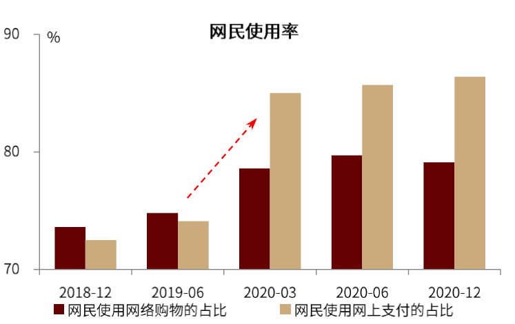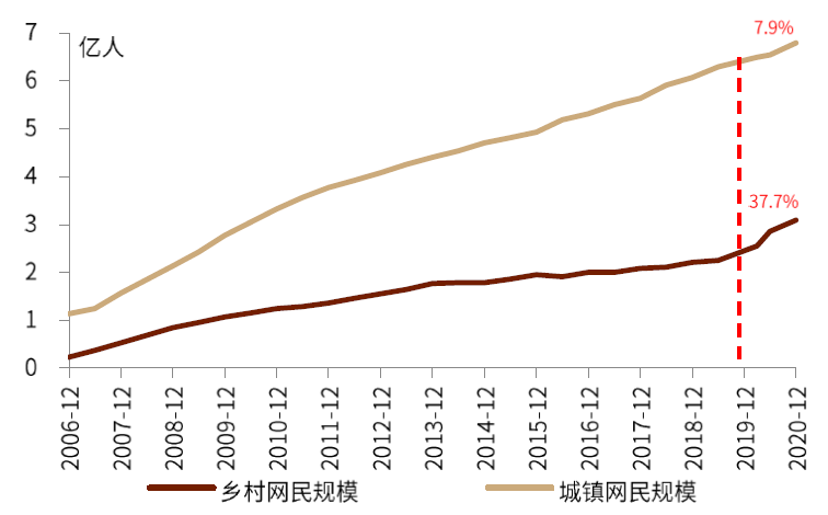 注:图中标红数字分别城镇和乡村2020年底网民规模较2019年中的增幅。