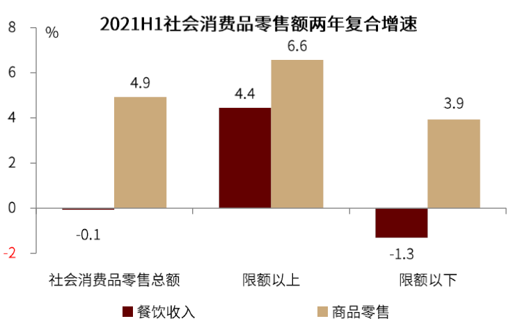 注:受乘用车国标切换影响,2019年6月汽车消费出现跳升,并对2020年6月同比增速、2021年6月两年复合增速形成基数扰动,图中将这3个异常值剔除。