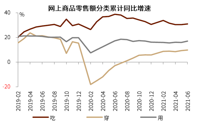 可选品和必需品消费分化:2021年上半年,居民主要消费支出项中,食品烟酒为代表的必需品消费支出,两年复合增速达9.5%,比总体消费支出增速高4.1个百分点。而其他各品类支出增速均低于总体消费,尤其是医疗保健、文教娱乐等,两年复合增速的降幅超过8个百分点。疫情期间相对受益的线上商品消费也存在分化,比如吃、穿、用三大类商品中,也只有必需品的吃类消费增速回到疫情前,穿和用类的线上消费未完全修复。