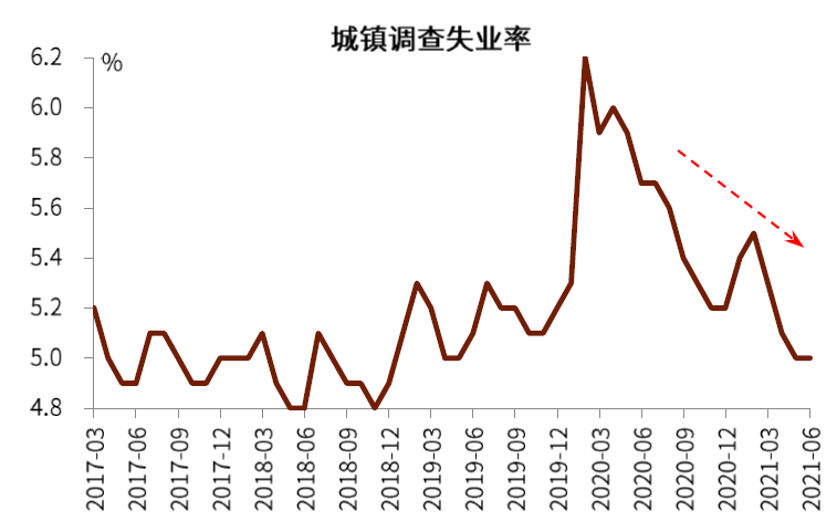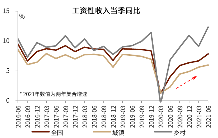 从总体来看,疫情后居民的就业和收入呈现改善态势,受冲击较大的群体就业情况也在好转。2021年6月城镇调查失业率降至5%,较疫情期间的最高点回落了1.2个百分点,已低于2019年同期水平。在疫情期间受影响较大的群体,比如农村外出务工劳动力,就业也在改善。截至2021年2季度,外出农民工数量已基本持平于2019年同期。工资性收入是居民收入的主要来源,伴随经济修复和就业改善,居民工资收入自疫情以来增速持续回升,对居民总体收入的增长形成一定支撑。总体来看,在经济平稳增长、没有重大冲击的情况下,消费仍有修复空间。