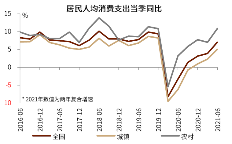 城乡之间的消费分化:城乡的产业结构和消费结构差异,使得城镇消费在疫情后修复更为缓慢。从产业结构来看,城镇服务业就业占比较乡村更高,包括住宿餐饮、商务服务等受疫情持续压制的行业,对城镇的收入修复拖累更为明显。同时,城镇居民消费结构中,文教娱乐等线下服务业占比更高,这些消费行为在疫情中受阻,也降低了城镇居民的平均消费倾向。收入和消费倾向的同步下行,拖累了城镇居民消费的修复进程。2021年2季度,城镇居民消费支出两年复合增速5.1%,较疫情前(2019年4季度)下滑3.2个百分点,而农村居民消费支出两年复合增速达10.9%,已基本持平于疫情前增速。