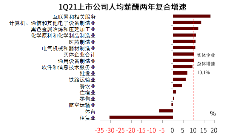 疫情压制的长期存在,意味着疫情期间“受伤”的行业和企业,未来的收入修复可能仍较为缓慢。疫情对线下服务业影响较大,这些行业从业人员的收入增长偏弱。比如2021年1季度非金融地产类上市公司的人均薪酬两年复合增长了10.1%,而同期住宿、餐饮、零售等行业的人均薪酬增速均在5%以下,航空运输、体育、租赁等行业甚至出现了薪酬负增长。小微企业、个体工商户主要集中在批发零售、住宿餐饮、居民服务等行业,而这些行业恰恰是受到疫情持续压制的行业,受影响更大。