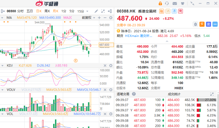华盛资讯8月23日消息,香港交易所今日跳空高开,早盘大涨逾5%。截至发稿,港交所涨5.27%,现报487.6港元每股,最新总市值6183亿港元,暂成交8.593亿港元。