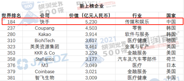 尽管港股市值自高位蒸发超过1.4万亿港元,快手依然以5230亿元的价值新晋榜单,在7家新上榜的企业中排名第一,世界排名第184位。