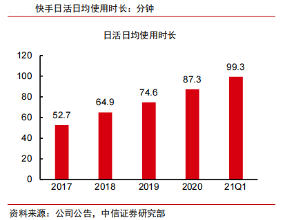不过得益于公司持续的内容和场景运营,更多垂类内容的深挖和公域时长的快速增长,太平洋证券认为Q2用户日均使用时长环比有望达到双位数的增长。2021年Q1,快手日活用户日均使用时长已经达到99.3分钟,Q2则大概率有望突破100分钟,用户粘性进一步提高。