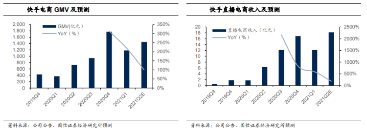这也造就了快手电商GMV的高增长和高复购,Q1电商GMV高达1186亿元,同比暴增219%。国信证券预计,Q2电商GMV有望达到1450亿元,同比增长100%,环比增长22%。电商收入将达到18亿元,货币化率有所提升。
