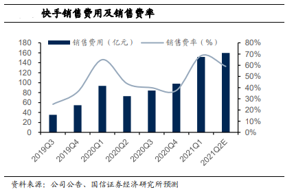 国信证券预计,快手Q2销售费用将达到113亿元,同比增长101%,环比略增3%;销售费用率则为59%,同比增加15%,但环比下降了约10%。