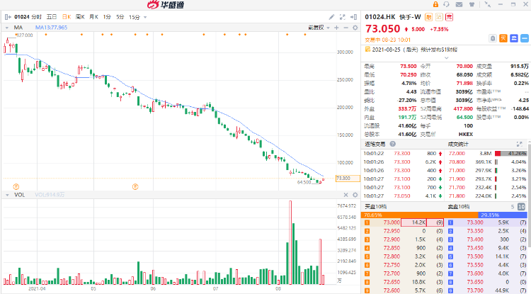 由于受监管政策和市场情绪影响,快手股价出现了大幅度的调整。不过临近财报发布,股价出现积极的迹象。上周五(8月20日),在恒指大跌1.8%的情况下快手依然逆势大涨3.5%,今日(8月23日)再高开4%,连续两日反弹。截至发稿,快手大涨超7%报73.05港元,市值重回3000亿港元上方。
