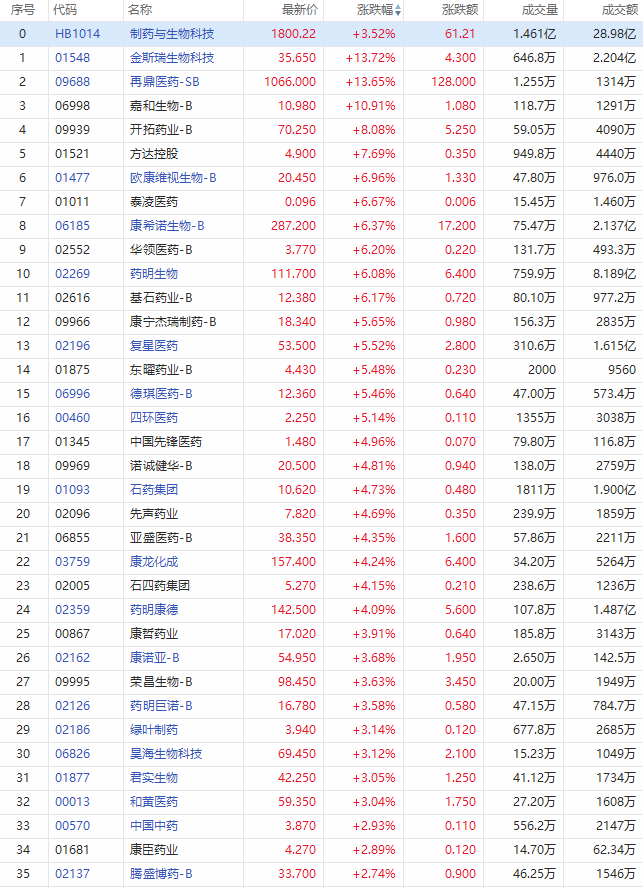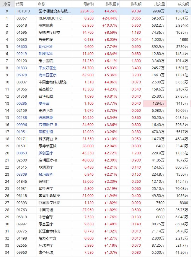 医疗设备股亦大涨,截至发稿,京东健康上涨10.07%;复锐医疗科技上涨8.69%;现代牙科上涨7.74%;朝聚眼科、康宁医药涨超6%;平安好医生、海吉亚医疗涨超5%;爱帝宫、意思健康、科济药业等涨超3%。