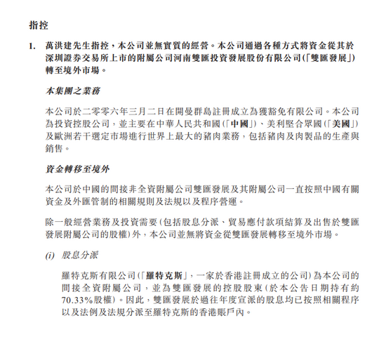 万洲国际:除一般经营业务及投资需要外 公司并无将资金从双汇发展转移至境外市场