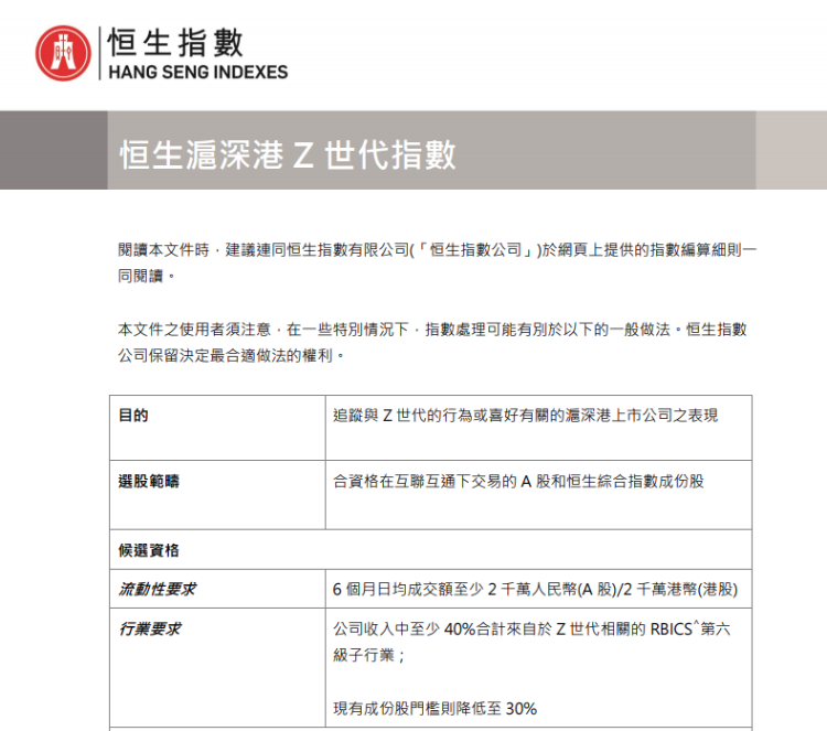 恒生指数公司今日推出了恒生沪深港(特选企业)高股息率指数及恒生沪深港Z世代指数两项新指数。其中恒生沪深港Z世代指数追踪与Z世代的行为或喜好有关的沪深港上市公司之表现。