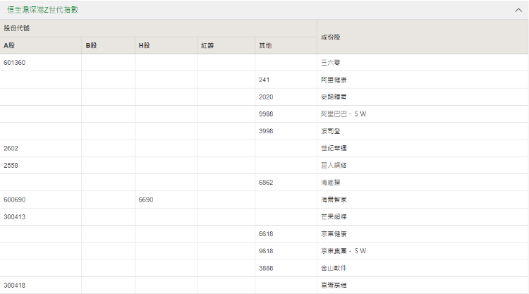 恒生沪深港Z世代指数中包括腾讯控股、美团、阿里巴巴、小米集团、网易、安踏体育、李宁、泡泡玛特、海底捞等个股。