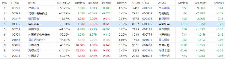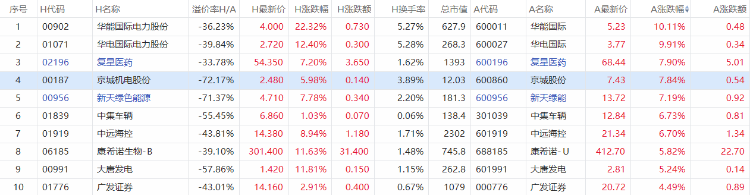 以A股收盘时间,AH股涨幅前10如下: