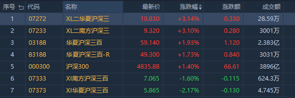 沪深300指数上涨1.40%。其中,华夏沪深三百-R(83188.HK)涨1.73%,成交额3031万港元;华夏沪深三百ETF(03188.HK)涨1.93%,成交额2.383亿港元。