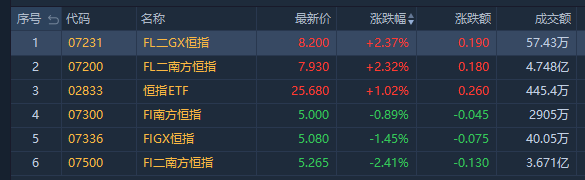 看多恒指相关ETF走强,南方两倍做多恒科(07226.HK)涨3.65%,成交额2.059亿港元;