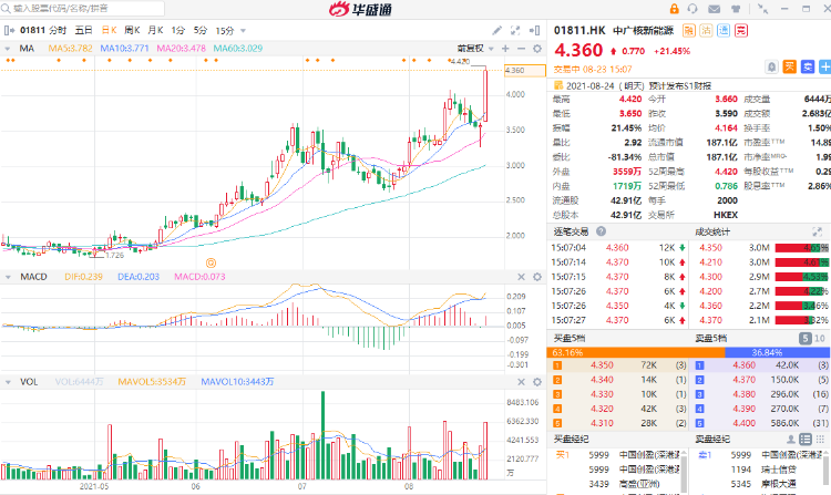 华盛资讯8月23日消息,中广核新能源(1811.HK)午后一度飙涨22%,最高报4.42港元,创历史新高价,现涨幅收窄至21.45%,报4.36港元,总市值超185亿港元。