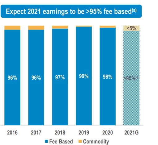 从该公司收入的一致性也可以看出其业务的稳定性。欧尼克预计大宗商品收入的百分比会更高,这在目前是有利的,因为天然气需求强劲且大宗商品交易处于三年高位。该公司2021年第一季度调整后的EBITDA增至8.66亿美元,比2020年第四季度增长16%。因此,其第一季度可分配现金流轻松覆盖了股息的1.6倍。