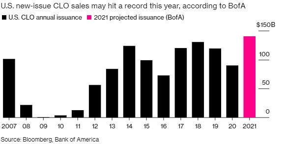 在目前这种通胀环境中,杠杆贷款因其低价格和高收益而受到青睐。贷款抵押债务 (CLO) 是将杠杆贷款证券化并作为单一工具进行管理的投资组合。由于 CLO 的结构是浮动利率工具,因此投资者将受益于未来的加息。在经济复苏之际,CLO是一种热门商品。在2021年上半年,并购活动接近历史最高水平,新增贷款发行量巨大;美国银行预计2021年新CLO发行量将创下历史新高。