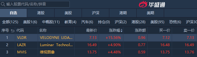 美股激光雷达概念股涨幅居前,Velodyne(VLDR.O)涨近16%,Luminar(LAZR.O)涨近5%,维视图像(MVIS.O)超4%。