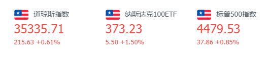 道指涨215.63点,或0.61%,报35335.71点;纳指涨227.99点,或1.55%,报14942.65点;标普500指数涨37.86点,或0.85%,报4479.53点。