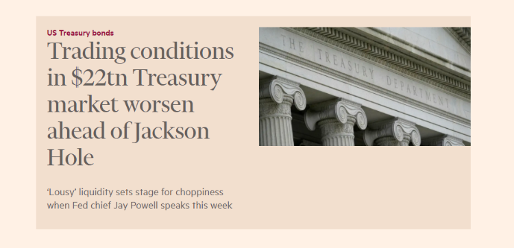 美国国债市场的规模高达22万亿美元,是全球金融体系的基石。各路交易员都在静待美联储主席鲍威尔本周的重要讲话,美债市场的流动性随之出现恶化。