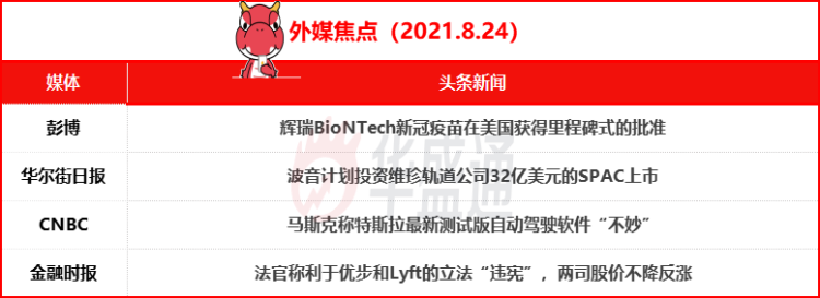 美股周一收高,纳指创盘中与收盘历史最高纪录。受FDA首次全面批准一款新冠疫苗消息提振,重新开放概念股普遍攀升。市场聚焦本周的美联储杰克逊霍尔年会,希望从中寻找有关缩减购债计划的线索。