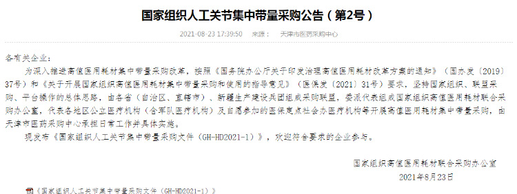 第二批耗材集采即将开始。8 月 23 日,国家组织高值医用耗材联合采购办公室发布《国家组织人工关节集中带量采购文件(GH-HD2021-1)》,本次人工关节集中带量采购产品为初次置换人工全髋关节、初次置换人工全膝关节。根据文件,各产品系统类别的意向采购量按参加本次集中带量采购的每一家医疗机构报送各产品系统采购需求量的90%累加得出。其中,髋关节产品系统首年意向采购总量305542个,膝关节产品系统231976个。