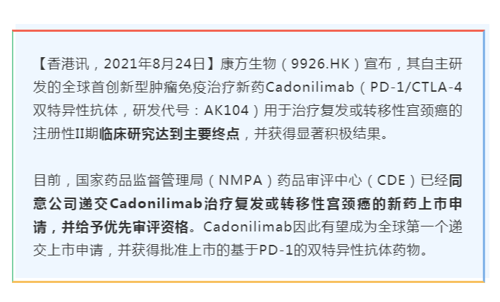 8月24日,康方生物 $13137.HK 宣布已获得CDE 同意提交其自主研发的全球首创新型肿瘤免疫治疗新药 Cadonilimab(PD -1/CTLA -4 双特异性抗体,研发代号:AK104)用于治疗复发或转移性宫颈癌的新药上市申请,并且获得优先审评资格。