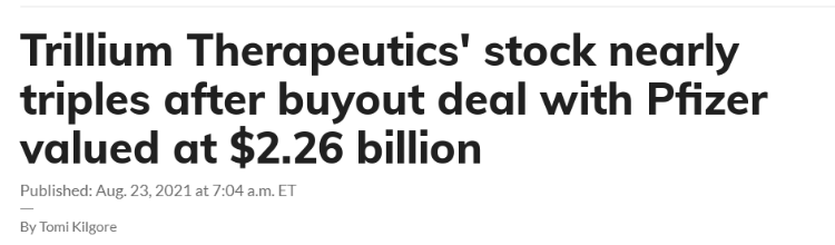 8月23日,辉瑞Pfizer和Trillium Therapeutics $TRIL 宣布,已经达成了一项协议,辉瑞将收购肿瘤免疫疗法研发公司Trillium Therapeutics。根据协议条款,辉瑞将以22.6亿美元收购Trillium Therapeutics所有已发行股票,Trilliumg隔夜股价暴涨188%。