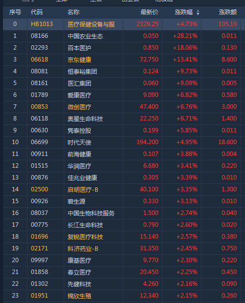 此次人工关节集采总计有49家企业的超过140个产品获得了医疗机构报送的采购需求,包括强生 $JNJ 、微创 $00853.HK 骨科、春立 $01858.HK 、爱康 $01789.HK 、山东威高海、施乐辉、博玛医疗、爱康宜诚、贝朗医疗等国内外医疗器械企业。今日港股医疗保健板块全线大涨。