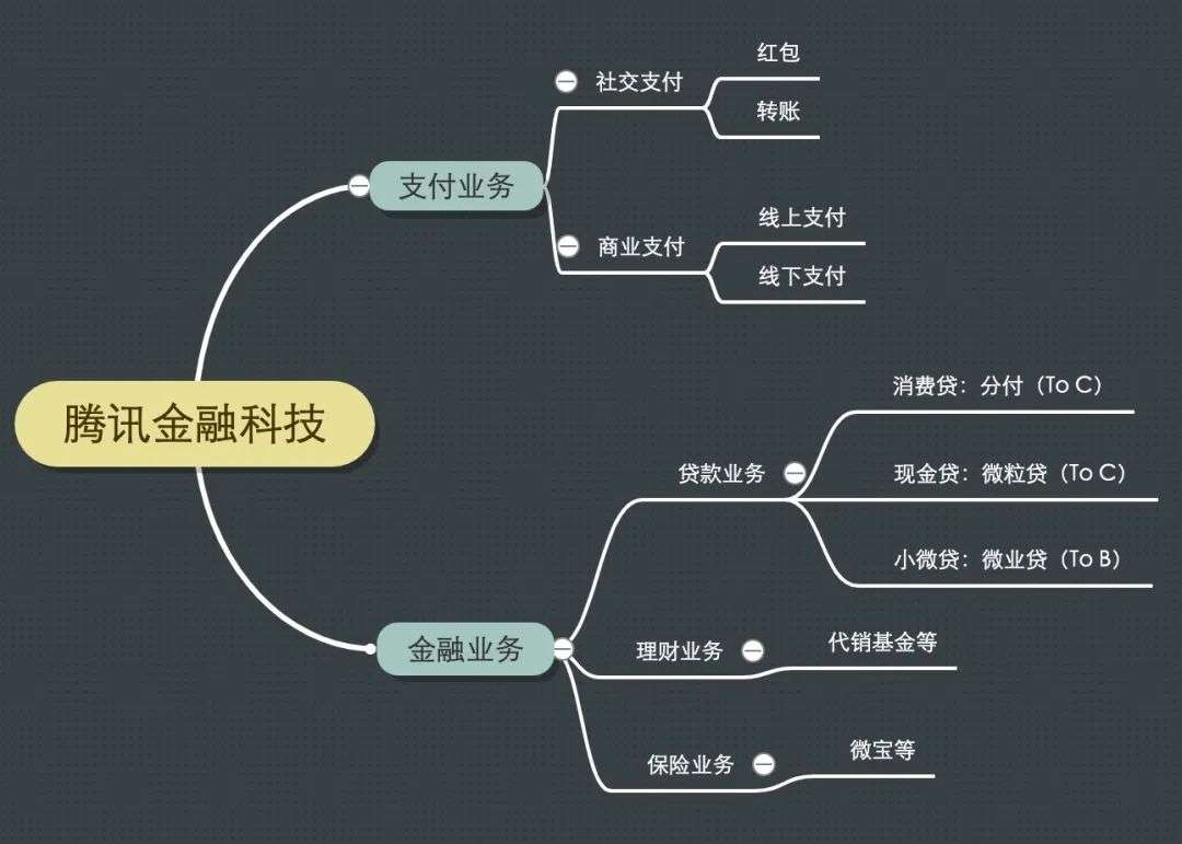 好,明确了金融业务在腾讯版图中的地位,我们来看一看金融业务的构成是怎样的,腾讯金融科技业务从大的模块上分为支付业务和金融业务。