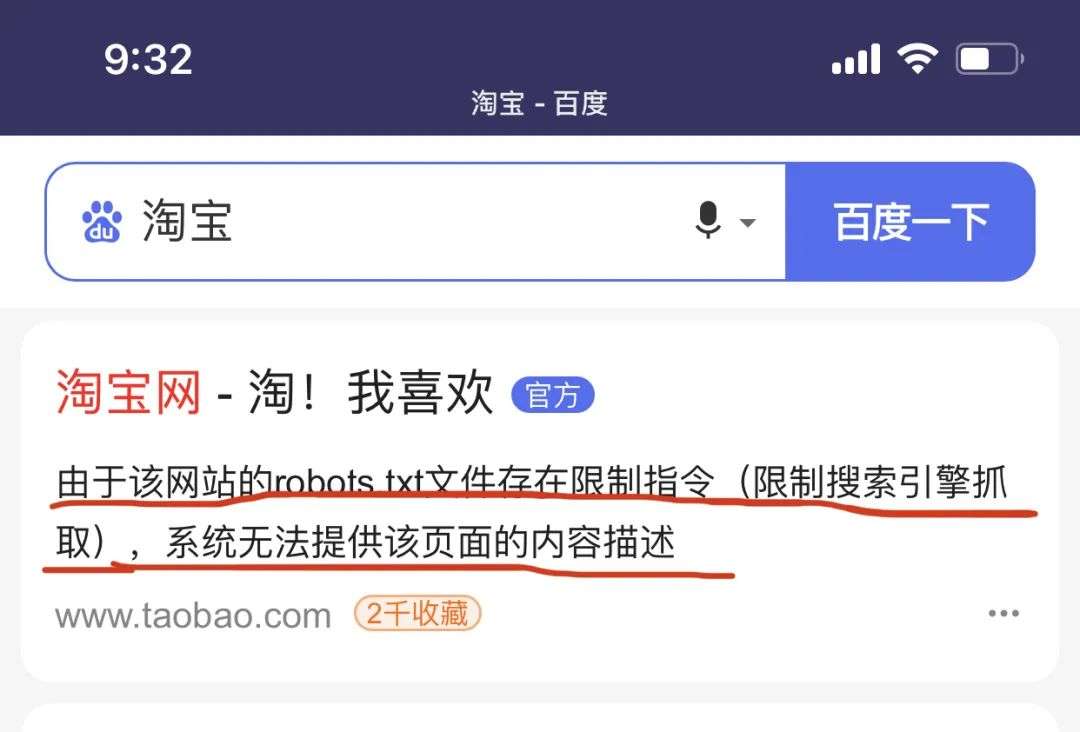 2008年9月9日,淘宝宣布禁止了百度的爬虫,正式封杀百度,这在当年的互联网界也引起了轩然大波。