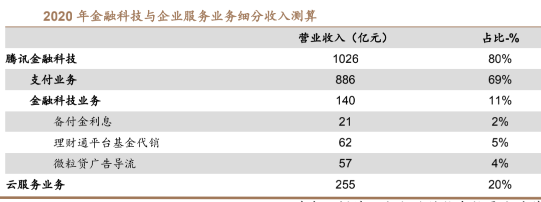 在腾讯的财报中,支付业务其实并没有单独列出来,而是总体归为“金融科技及企业服务”(2019年开始披露),其中“金融科技”即和支付相关的业务,而“企业服务”则主要是指云服务。