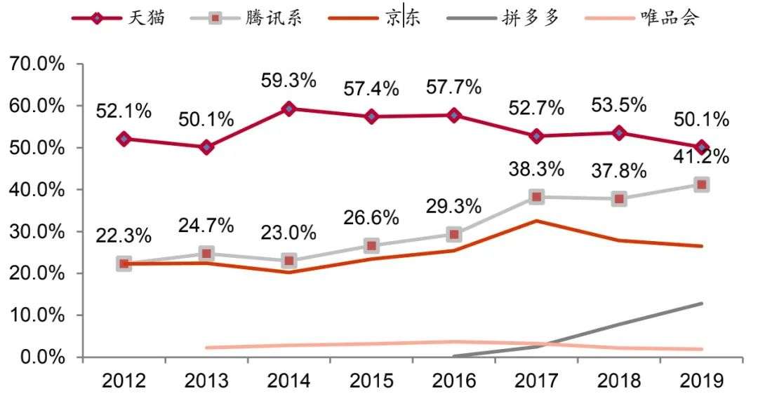 根据网经社数据,阿里系的在B2C的市场份额是在逐步下降的,而京东、拼多多和唯品会等腾讯系的总市场份额是在逐年上升的。