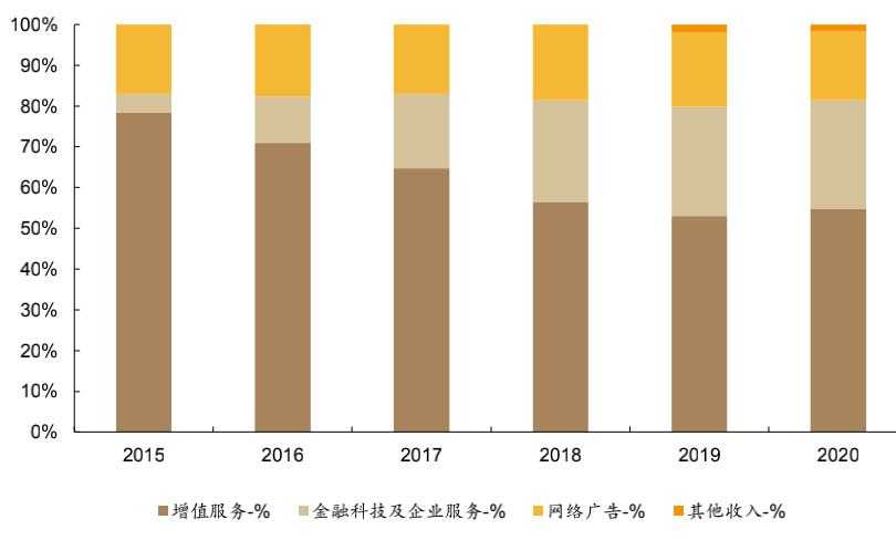 那这部分的收入占比和趋势是怎样的呢?我们来看一张腾讯收入结构变化图——