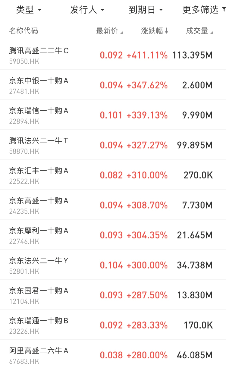 $27481.HK 京东中银一十购A涨347.62%; $22894.HK 京东瑞信一十购A涨339.13%。