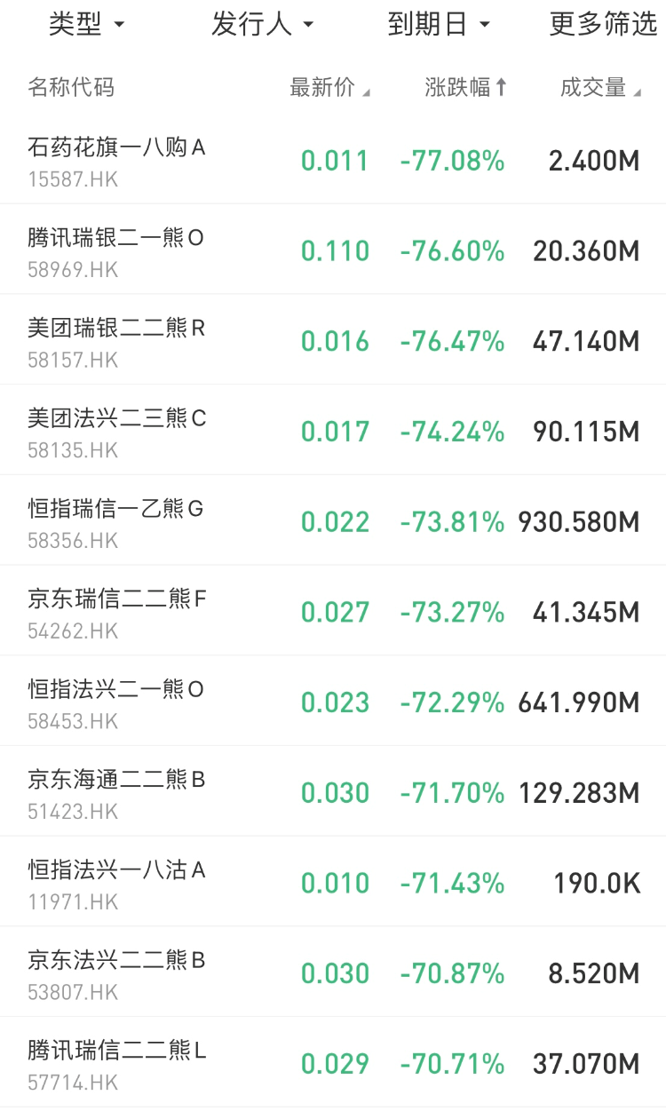 在今日跌幅榜中, $58969.HK 腾讯瑞银二一熊O跌76.60%; $58157.HK 美团瑞银二二熊R跌76.47%。