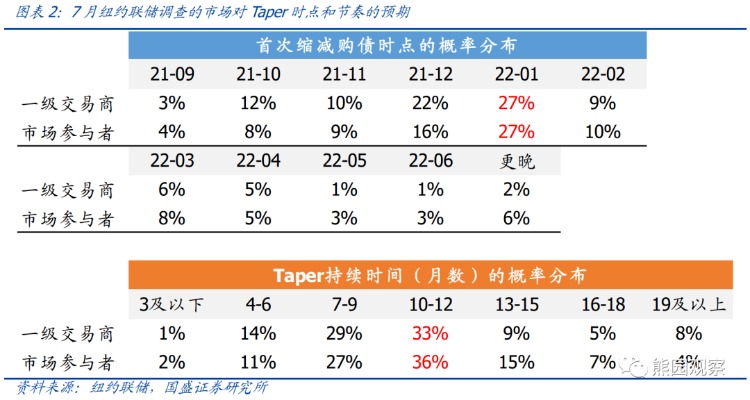 “根据联邦公开市场委员会(FOMC)最近的会议记录,我们认为美联储不会在杰克逊霍尔宣布Taper,最有可能的是在11月或12月宣布。至于真正实施应该会在2022年,且过程将非常缓慢,横跨10-12个月,甚至更长时间。在我们看来,有30%的可能性,最终德尔塔毒株和/或地缘政治危机会合力推迟Taper。”