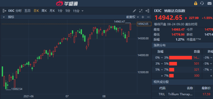 市场对事态进展的反应可能已经表现在股价上了,本周一,道指、标普500和纳指均同步上涨。纳指创盘中与收盘历史最高纪录。受FDA首次全面批准一款新冠疫苗消息提振,重新开放概念股普遍攀升。