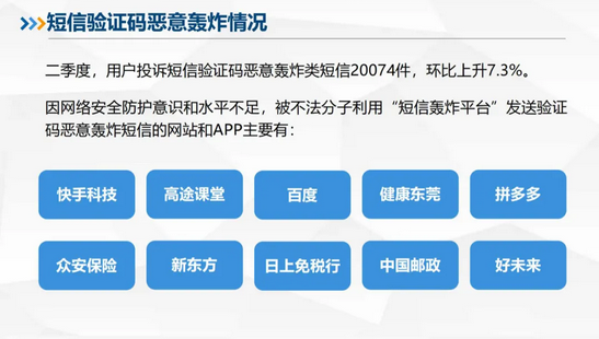 此外,二季度,用户投诉短信验证码恶意轰炸类短信20074件,环比上升7.3%。