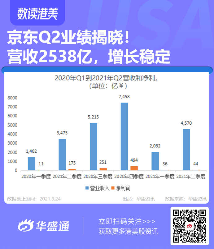 8月23日,京东集团发布了2021年第二季度及中期业绩。财报显示,2021年第二季度,京东集团净收入为2538亿元(约393亿美元),同比增长26.2%;经营利润为3亿元(约4,660万美元)。