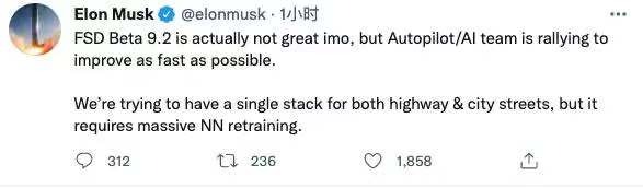 马斯克周一发布推文称,在他看来,全自动驾驶系统测试版FSD Beta 9.2实际上不是很好,但是Autopilot/AI团队正齐心协力尽快改进。