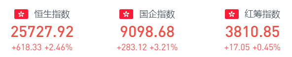 8月24日周二收盘,恒生指数大幅收涨2.46%或618.33点,报25727.92;国企指数上涨3.21%或283.12点,报9098.68;红筹指数收涨0.45%或17.05点,报3810.85点。