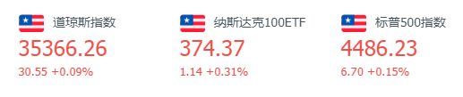道指涨30.55点,或0.09%,报35366.26点;纳指涨77.15点,或0.52%,报15019.80点;标普500指数涨6.70点,或0.15%,报4486.23点。