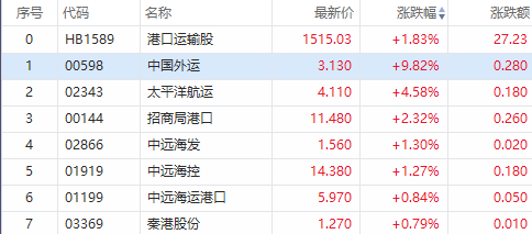 海运股走强,中国外运涨近10%,太平洋航运涨超4%,中远海控、中远海发涨逾1%。