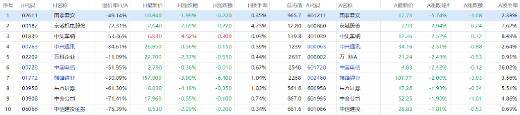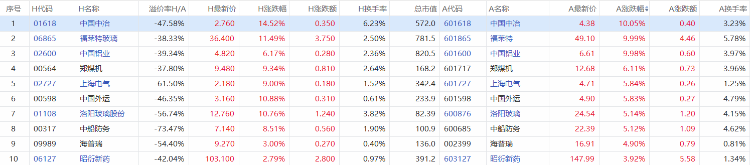 以A股收盘时间,AH股涨幅前10如下: