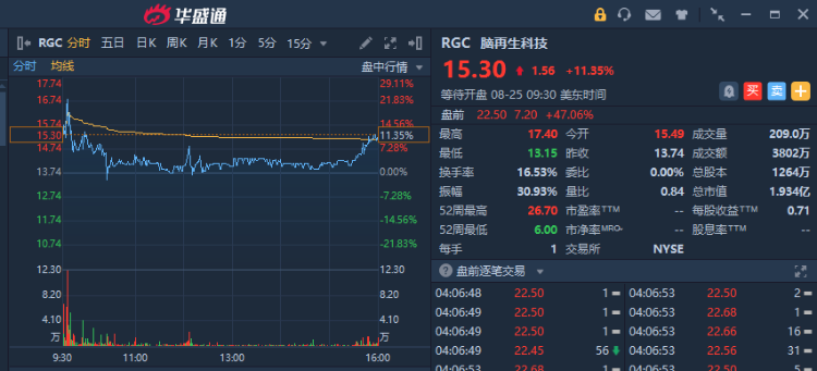 香港药物开发商脑再生科技(RGC)盘前拉升涨超47%,周二收涨逾11%。