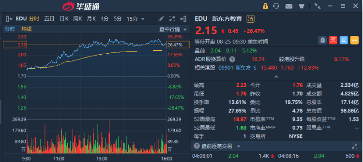 华盛资讯8月25日消息,今日美股盘前,中概股周二大幅反弹后今日盘前多数回调,金山云(KC)、新东方(EDU)跌超5%,贝壳(BEKE)跌3.5%,网易(NTES)跌2.3%,滴滴(DIDI)跌2%,阿里巴巴(BABA)、拼多多(PDD)跌约1.5%。